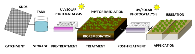 Las ciudades actuales están lejos de ser resilientes en la gestión del agua, el control de los eventos de escorrentía e inundaciones, y la mitigación de la sequía. La investigación de soluciones descentralizadas de gestión y tratamiento del agua, incluyendo infraestructura verde para la captación y tratamiento de agua de lluvia, puede proporcionar una fuente adicional de suministro de la misma apta para el uso, lo que implica beneficios importantes como niveles de calor más bajos en las ciudades, la reducción de las inundaciones y el crecimiento de la infraestructura urbana verde, incluida la agricultura urbana. La aplicación de diferentes soluciones basadas en la naturaleza (bio- y fitorremediación) ha demostrado ser una posible solución para la gestión de aguas residuales en muchas situaciones, pero es necesario desarrollar más investigación con el objetivo de consolidar su potencial de implementación. En particular, la combinación de estas tecnologías con procesos fotocatalíticos puede ser crucial para garantizar la eliminación de la presencia de patógenos y compuestos biorrecalcitrantes. La hipótesis principal de esta propuesta es que el agua de lluvia urbana podría ser recolectada y descontaminada eficientemente mediante estrategias de tratamiento factibles combinando tecnologías basadas en la naturaleza con tratamientos fotocatalíticos con el objetivo de ajustarse a los requisitos de calidad del agua para una serie de aplicaciones que sustituyan el uso del agua potable. En este proyecto se desarrollará innovadora tecnología fotocatalítica solar y UV-LED, incluido el desarrollo de nuevos catalizadores soportados basados en el TiO2 y el hierro, para cumplir con este objetivo. Además, se aplicarán metodologías de evaluación del ciclo de vida, entre otros enfoques, para evaluar la viabilidad económica y ambiental de la tecnología desarrolladas en el proyecto.